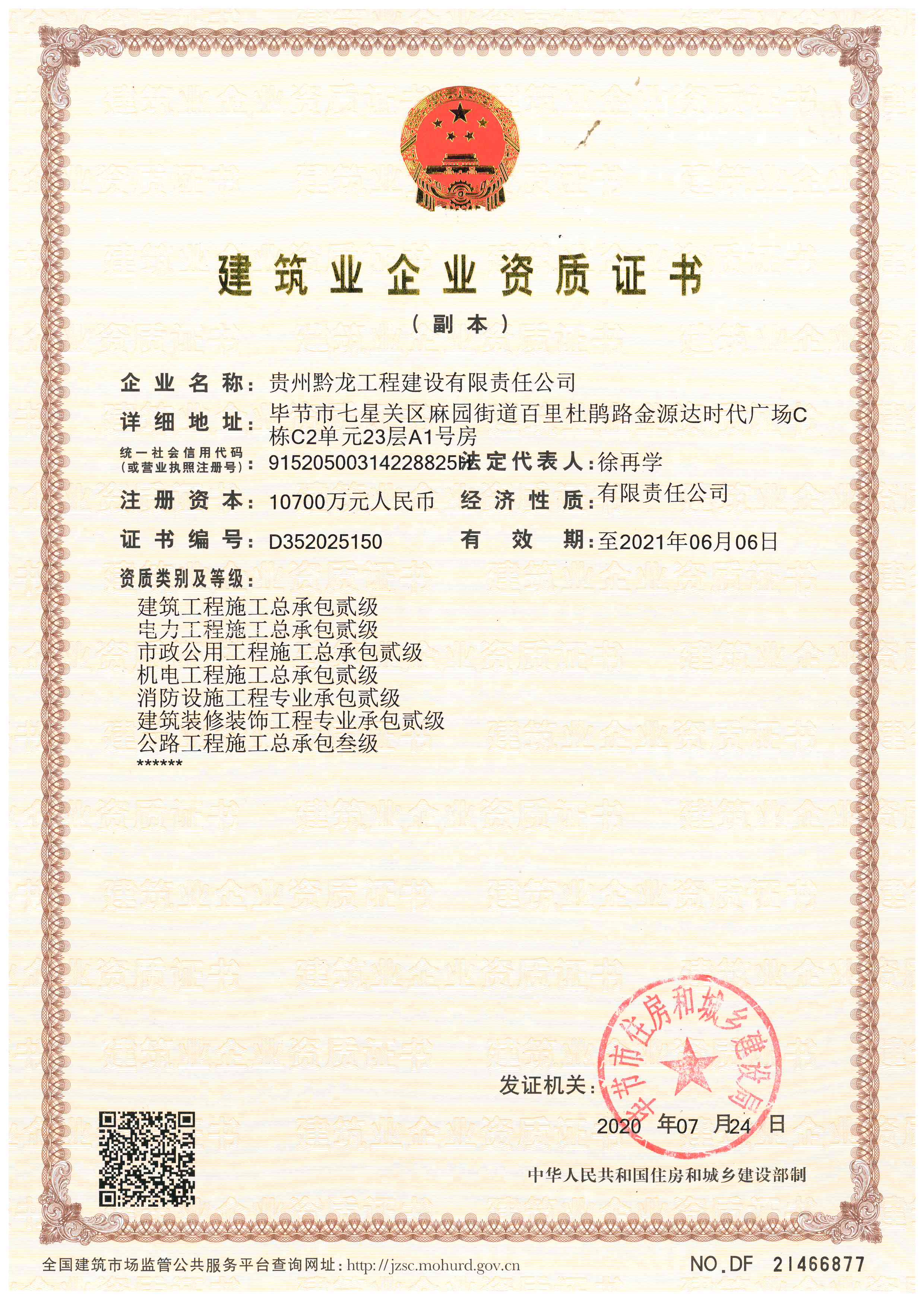 我公司自2014年10月23日公司成立以来,始终秉承着“知行合一,厚德笃行,众志成城,共建共享”的企业使命,对每一个项目进行严格、合法合规的管理,不断加强公司的专业技术能力,认真、严谨地施工,重视工程的安全与品质。通过公司全体员工多年来坚持不懈的努力,我公司终于在2020年7月24日获得“消防设施工程专业承包贰级”“建筑装饰装修工程专业承包贰级”两项资质增项,此次资质增项对我公司来说意义重大,标志着我公司专业技术能力的增强、业务板块的扩大,离我公司“构筑品质工程,缔造世纪黔龙”的企业愿景又近一步!