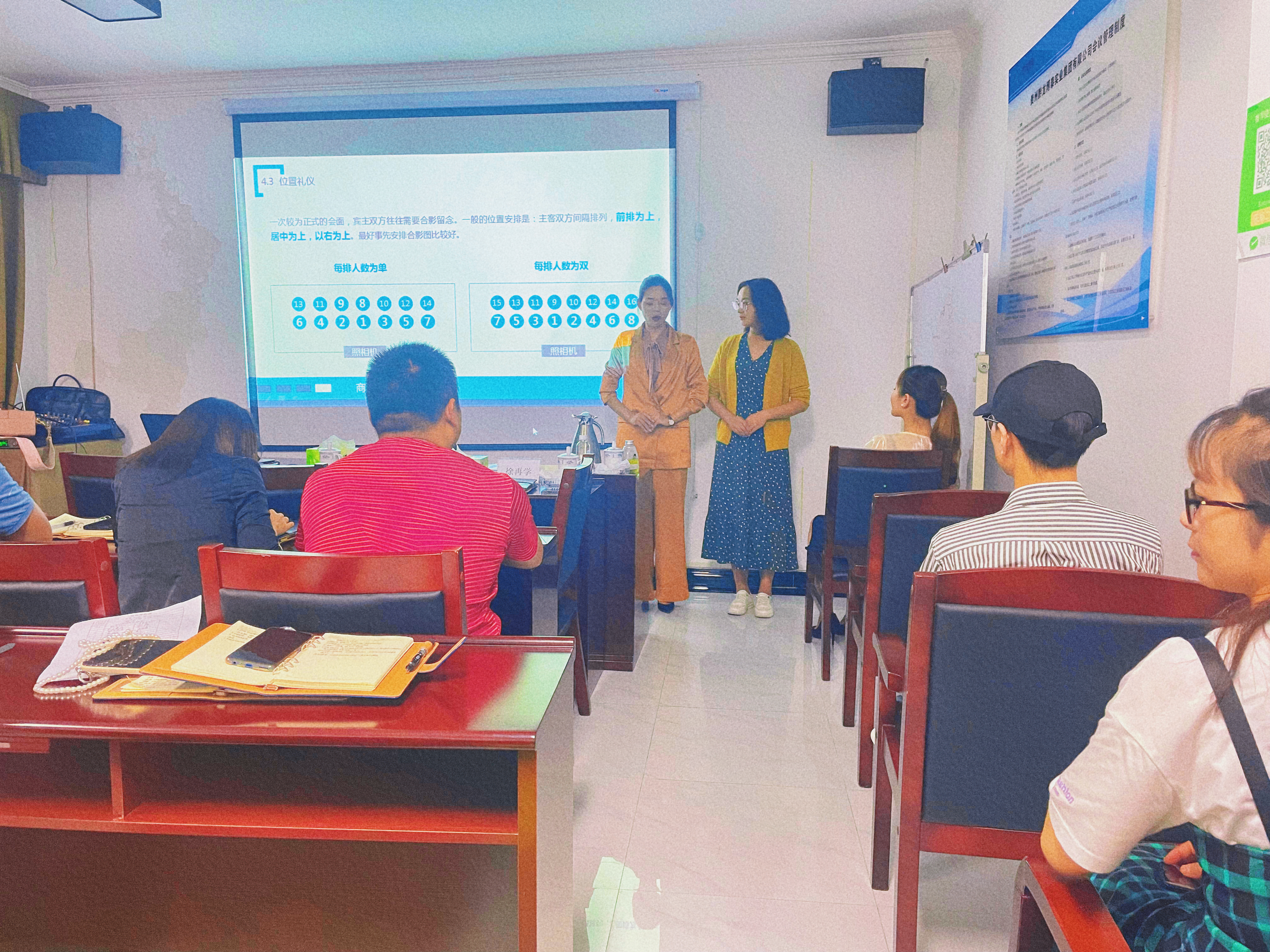 培训在顾芸老师激情洋溢的授课氛围中拉开了序幕,分别讲解了政务礼仪、形象礼仪、问候礼仪、乘车礼仪、餐桌礼仪、会议礼仪、握手礼仪、名片交换礼仪等。
